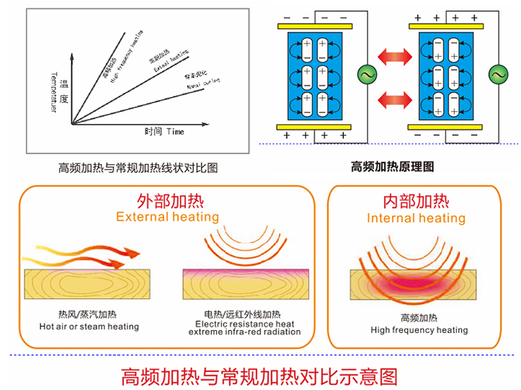 高頻干燥采用高頻電磁場作為加熱源,高頻設備將普通電源轉化成高頻電場,電磁場能夠穿透木材,木材中的水分子會吸收高頻電場,自身極化,分子間極速摩擦產生熱量,因而高頻加熱方式是水分自身產生的熱量,因而水分多的部分吸收高頻能量自然多,也就成就了高頻設備與生俱來的優勢。